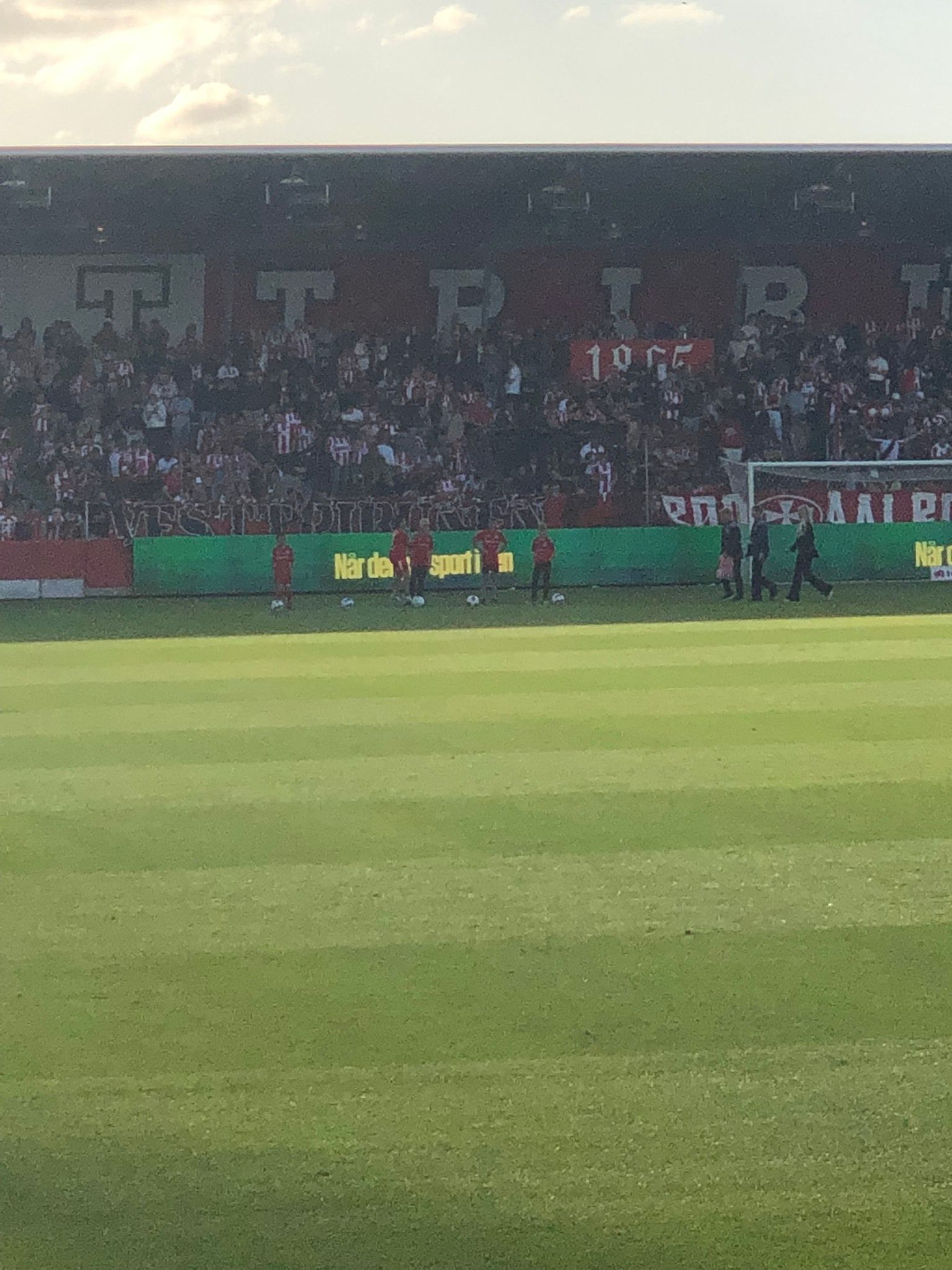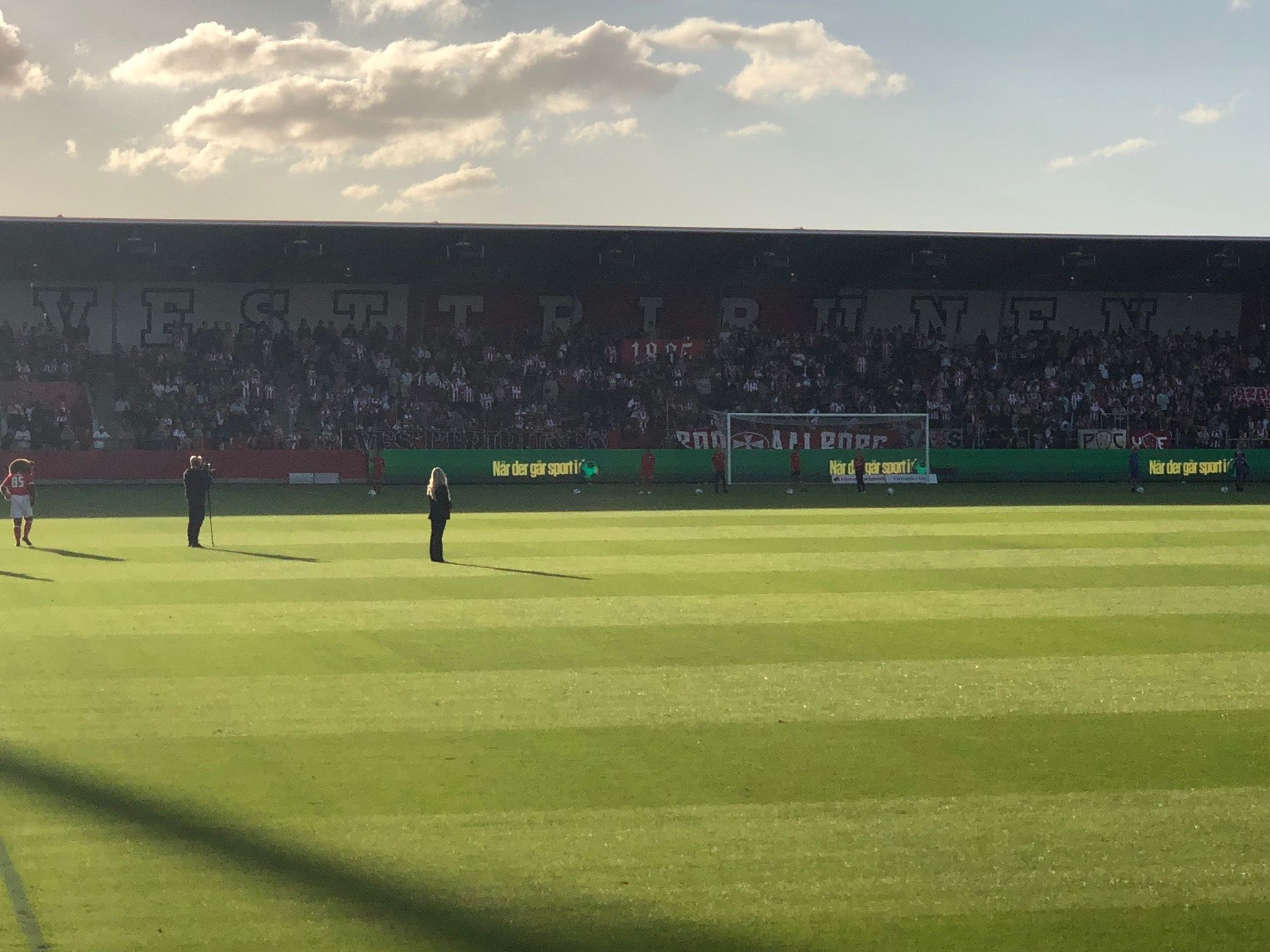 I pausen var 5 NFB drenge fra U12 drenge på grøntsværen og deltog i en konkurrence der var arrangeret af AaB og imens 9000 tilskuere kiggede på.