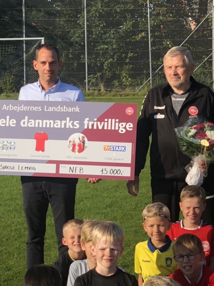 På billedet ses Børge sammen med filialchef Jesper Høholt Jensen fra Arbejdernes Landsbank i Nørresundby. Børge har fået en buket blomster og invitationen til DBU arrangement i København og Jesper Høholt Jensen holder checken på de 15.000,-