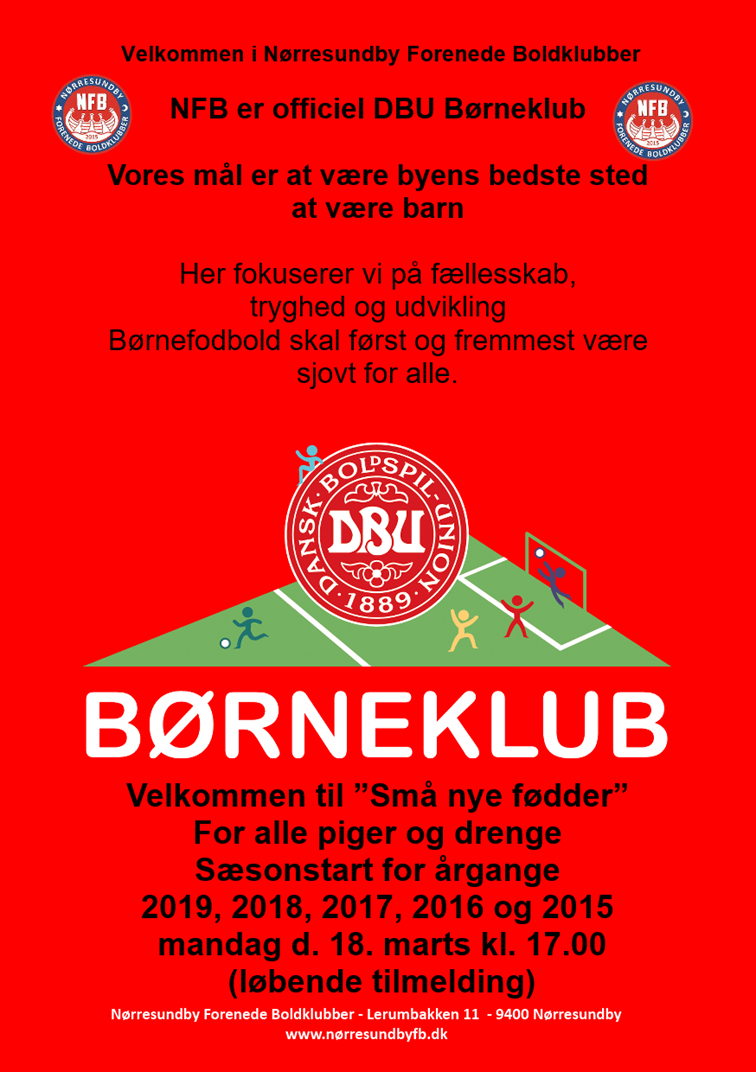 Nørresundby Forenede Boldklubbers børnefodbold foregår på banerne på Lerumbakken – centralt placeret i Nørresundby. Her byder vi piger og drenge velkommen til fællesskab, fodbold og sjove oplevelser. Vi er DBU børneklub. Det betyder, at vi prioriterer børnefodbold og spiller på børnenes præmisser.